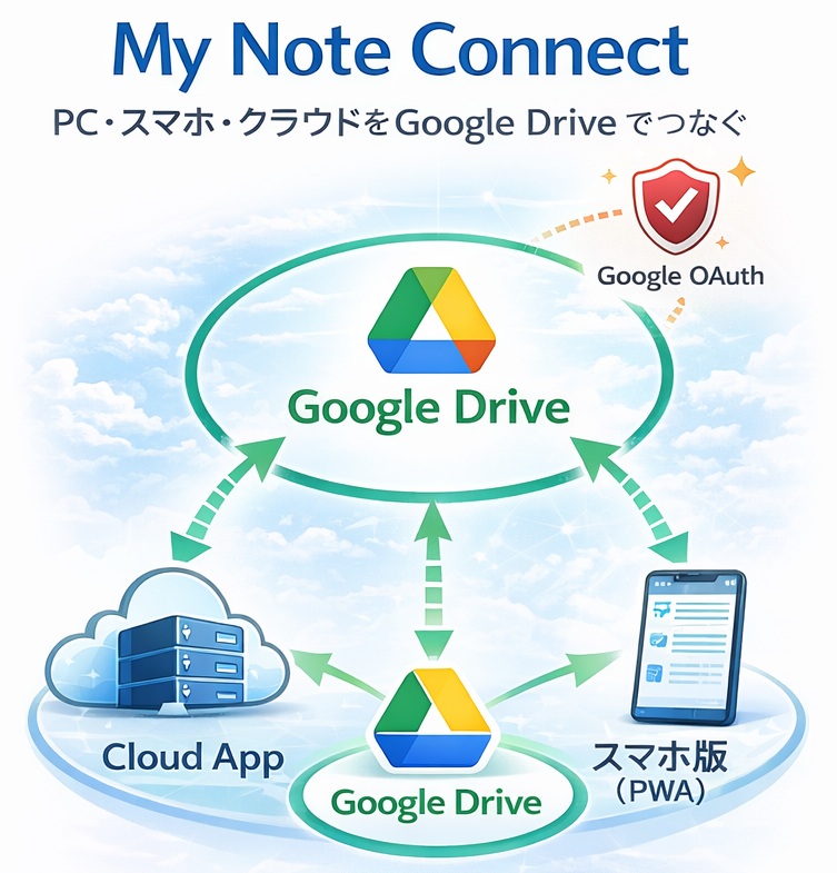この3つを Google Drive が仲介する「My Note Connect」 という構成で開発しています。